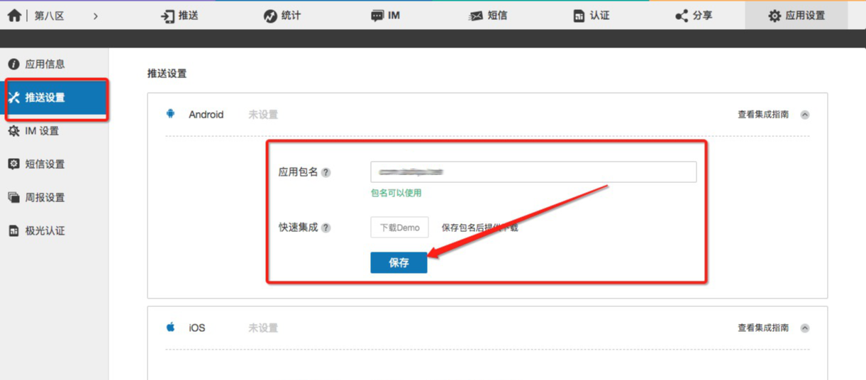 将包名填写入【极光推送→推送设置】中,在应用包名填写好,并点击保存。